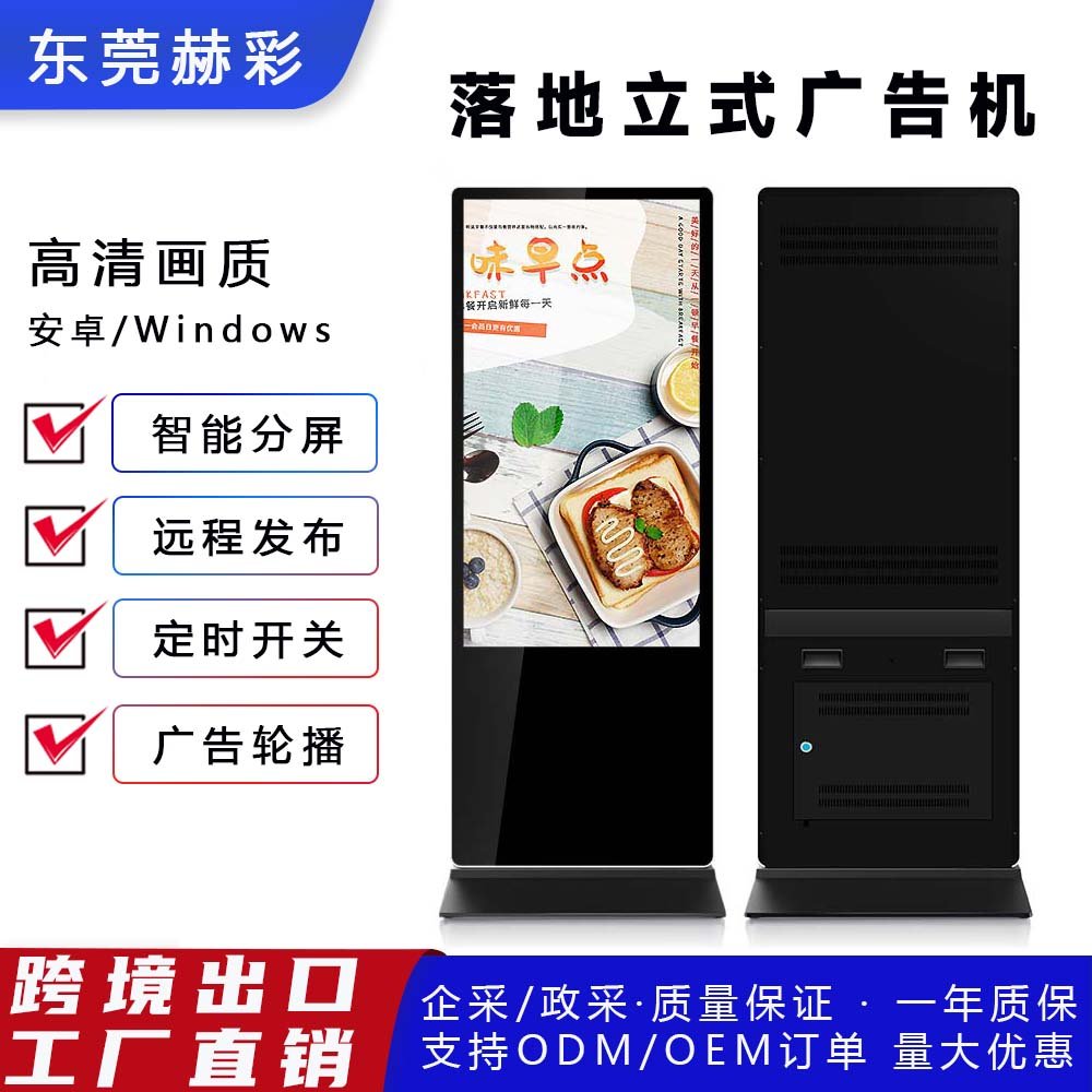 作为源头工厂,东莞赫彩坚持跨境出口级品质标准,每一台广告机都经过严格质检,稳定耐用、故障率低,同时支持ODM/OEM 定制,不管是外观、配置还是功能,都能根据你的需求专属打造。