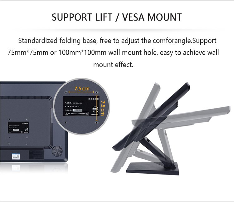 | Contrase ratio | 800/1 | Mount (optional) | 1) provide wall brackets for wall-mounting, VESA 75mm&100mm |